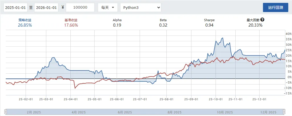 在回测之前,设置开始时间为2025年1月1日,结束时间为2026年1月1日。设置账户交易资金为10万元,交易频率为每天。