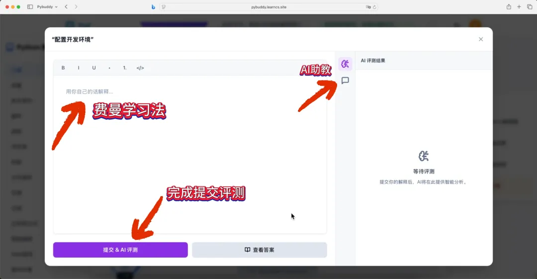 答:学习中用“AI派学长”引导思考;笔记完成后提交AI评测,AI 指出理解偏差、逻辑漏洞和遗漏点。