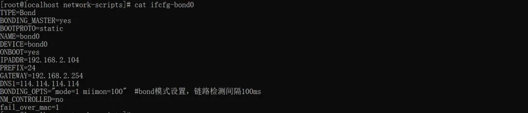 TYPE=BondBONDING_MASTER=yesBOOTPROTO=staticNAME=bond0DEVICE=bond0ONBOOT=yesIPADDR=192.168.2.100PREFIX=24GATEWAY=192.168.2.254DNS1=114.114.114.114BONDING_OPTS="mode=4 miimon=100 ad_select=1 xmit_hash_policy=layer3+4"NM_CONTROLLED=no