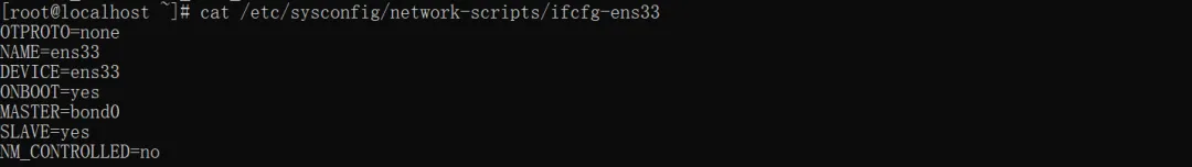 TYPE=EthernetBOOTPROTO=noneNAME=ens33DEVICE=ens33ONBOOT=yesMASTER=bond0SLAVE=yesNM_CONTROLLED=no