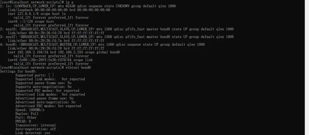 ip addrethtool bond0 # 查看 bond0 带宽(Mode4、Mode6 模式下,两块千兆网卡绑定后带宽应为 2000Mb)