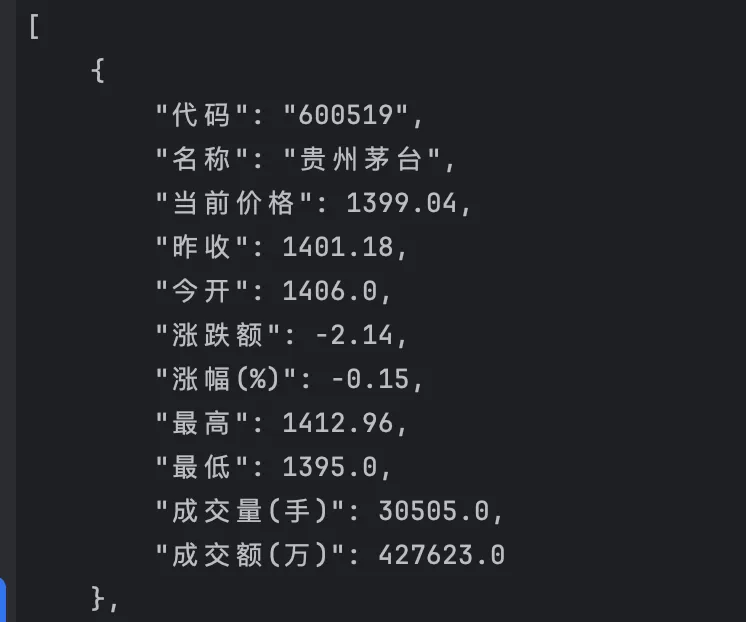 import requestsimport jsondef get_stock_data(stock_codes):# 拼接接口 URLurl = f"https://web.sqt.gtimg.cn/q={','.join(stock_codes)}"headers = {'User-Agent': 'Mozilla/5.0 (Windows NT 10.0; Win64; x64) AppleWebKit/537.36 (KHTML, like Gecko) Chrome/91.0.4472.124 Safari/537.36','Referer': 'https://gu.qq.com/'}try:response = requests.get(url, headers=headers)# 腾讯接口返回编码通常为 GBK,需要手动解码response.encoding = 'gbk'text = response.textresults = []# 按行分割数据(如果有多个股票)lines = text.strip().split(';')for line in lines:if not line:continue# 提取 ~ 分隔的数据部分# 格式为: v_sz000001="51~平安银行~000001~..."# 我们需要引号内的内容content = line.split('~')print(content)if len(content) > 32:stock_info = {"代码": content[2],"名称": content[1],"当前价格": float(content[3]),"昨收": float(content[4]),"今开": float(content[5]),"涨跌额": float(content[31]),"涨幅(%)": float(content[32]),"最高": float(content[33]),"最低": float(content[34]),"成交量(手)": float(content[36]),"成交额(万)": float(content[37])}results.append(stock_info)return resultsexcept Exception as e:print(f"请求出错: {e}")return None# 测试:查询茅台、平安银行、腾讯控股codes = ['sh600519', 'sz000001', 'hk00700']data = get_stock_data(codes)if data:print(json.dumps(data, indent=4, ensure_ascii=False))