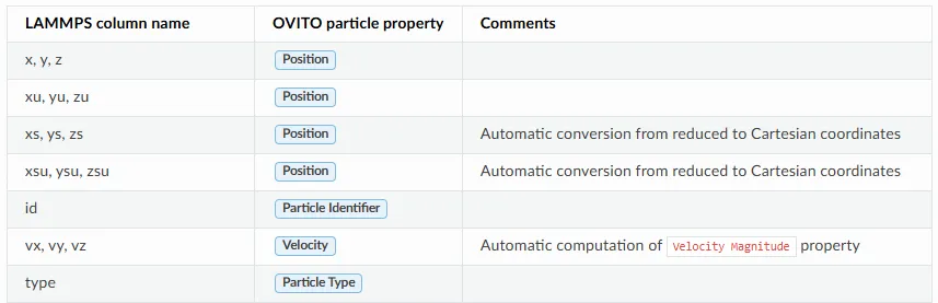 可以发现变量名自动发生了一些变化,比如id变成了Particle Identifier,xs、ys、zs变成了Position,vx、vy、vz变成了Velocity,自定义的变量名中的大写字母变成了小写,比如v_FP变成了v_fp等等。这个OVITO文档里面列举了不少,可以自己去看LAMMPS dump file reader — OVITO User Manual 3.10.6 documentation