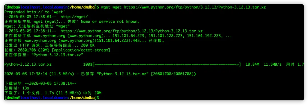 [dmdba@localhost ~]$ wget https://www.python.org/ftp/python/3.12.13/Python-3.12.13.tar.xz