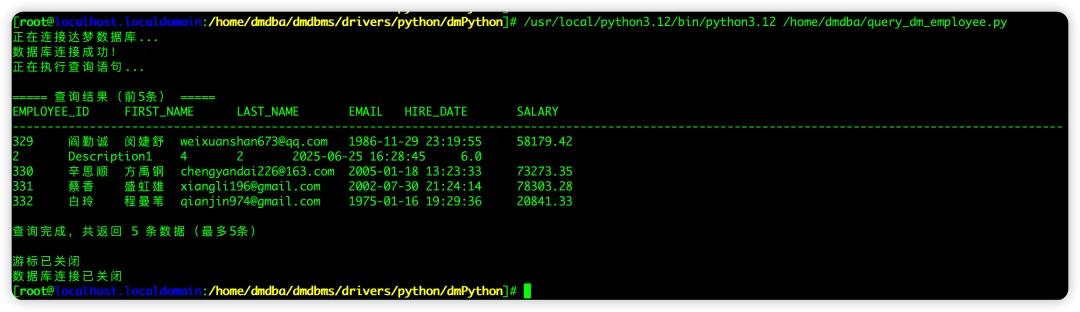 [dmdba@localhost ~]$ /usr/local/python3.12/bin/python3.12 /home/dmdba/query_dm_employee.py