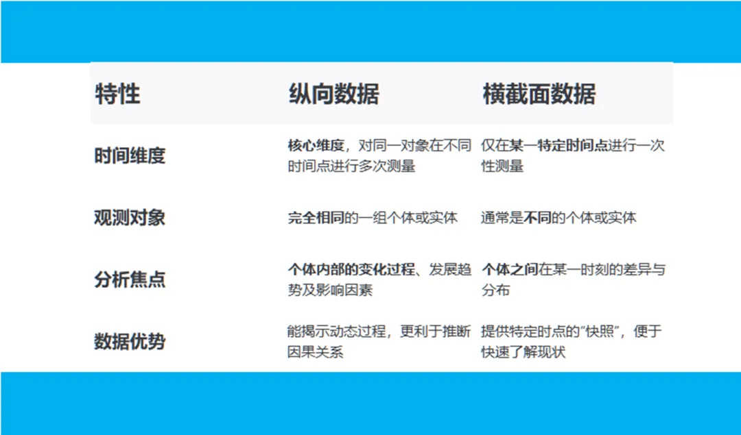 总的来说,纵向数据因其时间延续性对象一致性,成为了解事物动态发展过程、探究因果关系的强大工具。