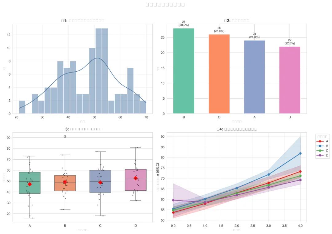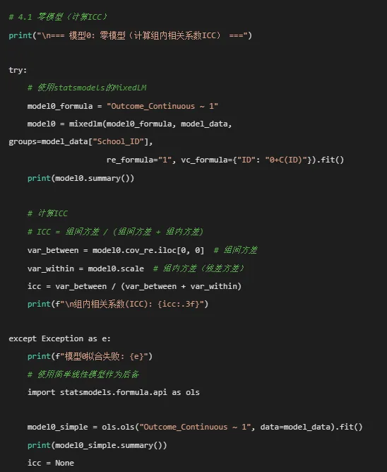 # 4.2 随机截距模型(加入时间固定效应)print("\n=== 模型1: 随机截距模型 ===")try:    model1_formula = "Outcome_Continuous ~ Time"    model1 = mixedlm(model1_formula, model_data, groups=model_data["School_ID"],                     re_formula="1", vc_formula={"ID""0+C(ID)"}).fit()print(model1.summary())except Exception as e:print(f"模型1拟合失败: {e}")    model1 = None# 4.3 随机截距和斜率模型(时间随机斜率)print("\n=== 模型2: 随机截距和斜率模型 ===")try:# 注意:Python中实现完全随机的斜率和截距可能更复杂# 我们使用学校水平的随机斜率和截距    model2_formula = "Outcome_Continuous ~ Time"    model2 = mixedlm(model2_formula, model_data, groups=model_data["School_ID"],                     re_formula="1+Time").fit()print(model2.summary())except Exception as e:print(f"模型2拟合失败: {e}")    model2 = None# 4.4 加入个体水平协变量print("\n=== 模型3: 加入个体水平协变量 ===")try:# 准备协变量    covariate_formula = "Time"if'Age'in model_data.columns:        covariate_formula += " + Age"if'Sex'in model_data.columns:        covariate_formula += " + C(Sex)"if'Baseline_Score'in model_data.columns:        covariate_formula += " + Baseline_Score"    model3_formula = f"Outcome_Continuous ~ {covariate_formula}"    model3 = mixedlm(model3_formula, model_data, groups=model_data["School_ID"],                     re_formula="1+Time").fit()print(model3.summary())except Exception as e:print(f"模型3拟合失败: {e}")    model3 = None# 4.5 完整模型(加入治疗和交互项)print("\n=== 模型4: 完整模型(加入治疗和交互项) ===")try:# 准备完整公式    full_formula = "Outcome_Continuous ~ Time"# 添加交互项if'Treatment'in model_data.columns:        full_formula += " * C(Treatment)"# 添加其他协变量    additional_vars = []if'Age'in model_data.columns:        additional_vars.append('Age')if'Sex'in model_data.columns:        additional_vars.append('C(Sex)')if'Baseline_Score'in model_data.columns:        additional_vars.append('Baseline_Score')if'Medication_Adherence'in model_data.columns:        additional_vars.append('Medication_Adherence')if'Stress_Level'in model_data.columns:        additional_vars.append('Stress_Level')if'Quality_of_Life'in model_data.columns:        additional_vars.append('Quality_of_Life')if additional_vars:        full_formula += " + " + " + ".join(additional_vars)    model4 = mixedlm(full_formula, model_data, groups=model_data["School_ID"],                     re_formula="1+Time").fit()print(model4.summary())# 保存模型结果    model4_summary = model4.summary().as_text()    with open(results_folder / "模型4_完整模型结果.txt"'w', encoding='utf-8') as f:        f.write(model4_summary)except Exception as e:print(f"模型4拟合失败: {e}")    model4 = None# 4.6 模型比较print("\n=== 模型比较 ===")models = {"模型0": model0 if'model0'in locals() else None,"模型1": model1 if'model1'in locals() else None,"模型2": model2 if'model2'in locals() else None,"模型3": model3 if'model3'in locals() else None,"模型4": model4 if'model4'in locals() else None}model_comparison = []for name, model in models.items():if model is not None:        try:            model_comparison.append({"模型": name,"AIC": model.aic,"BIC": model.bic,"对数似然值": model.llf,"参数个数": model.df_model + 1,  # 包括方差参数"收敛状态""是"if model.converged else"否"            })        except:            model_comparison.append({"模型": name,"AIC""NA","BIC""NA","对数似然值""NA","参数个数""NA","收敛状态""否"            })else:        model_comparison.append({"模型": name,"AIC""NA","BIC""NA","对数似然值""NA","参数个数""NA","收敛状态""否"        })model_comparison_df = pd.DataFrame(model_comparison)print(model_comparison_df)# 保存模型比较结果save_to_excel(model_comparison_df, "3_模型比较结果.xlsx", results_folder)# 创建三线表HTMLhtml_table = create_table_three_line(model_comparison_df, "表4: 多层线性模型比较(三线表)")with open(results_folder / "5_模型比较三线表.html"'w', encoding='utf-8') as f:    f.write(html_table)# ==============================================================================# 5. 模型结果提取与表格制作# ==============================================================================print("\n=== 提取模型结果并创建三线表 ===")# 5.1 提取最佳模型的结果best_model = model4 if model4 is not None else model3 if model3 is not None else model2if best_model is not None:# 提取固定效应    fixed_effects = pd.DataFrame({'Variable': best_model.params.index,'Estimate': best_model.params.values,'Std. Error': best_model.bse.values,'z_value': best_model.tvalues.values,'p_value': best_model.pvalues.values    })# 计算95%置信区间    fixed_effects['95% CI Lower'] = fixed_effects['Estimate'] - 1.96 * fixed_effects['Std. Error']    fixed_effects['95% CI Upper'] = fixed_effects['Estimate'] + 1.96 * fixed_effects['Std. Error']    fixed_effects['95% CI'] = fixed_effects.apply(        lambda row: f"({row['95% CI Lower']:.3f}, {row['95% CI Upper']:.3f})", axis=1)# 添加显著性标记    def add_significance(p):if p < 0.001:return'***'elif p < 0.01:return'**'elif p < 0.05:return'*'else:return''    fixed_effects['Significance'] = fixed_effects['p_value'].apply(add_significance)# 格式化p值    fixed_effects['p_value_formatted'] = fixed_effects['p_value'].apply(        lambda x: '<0.001'if x < 0.001 else f'{x:.3f}')# 选择需要的列    fixed_effects_table = fixed_effects[['Variable''Estimate''Std. Error','95% CI''z_value''p_value_formatted','Significance']].copy()    fixed_effects_table.colu
