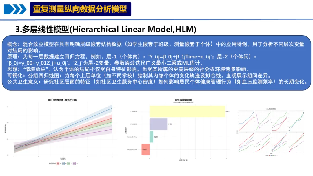 概念:混合效应模型在具有明确层级嵌套结构数据(如学生嵌套于班级,测量嵌套于个体)中的应用特例。用于分析不同层次变量对结局的影响。
