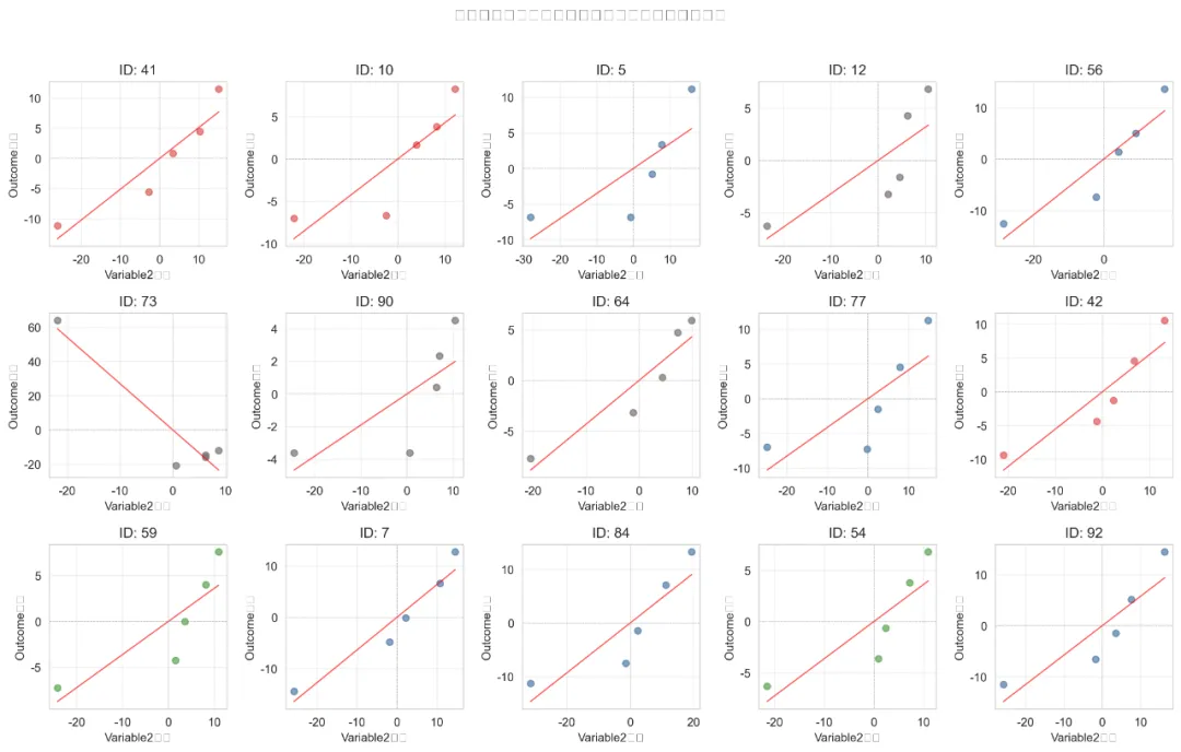可视化:分组回归线图:为每个上层单位(如不同学校)绘制其内部个体的变化轨迹及拟合线,直观展示组间差异。