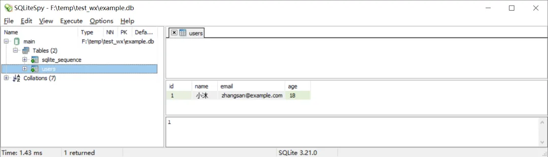 import sqlite3# 连接到SQLite数据库(如果不存在则创建)conn = sqlite3.connect('example.db')cursor = conn.cursor()# 创建表cursor.execute('''    CREATE TABLE IF NOT EXISTS users (        id INTEGER PRIMARY KEY AUTOINCREMENT,        name TEXT NOT NULL,        email TEXT NOT NULL,        age INTEGER    )''')# 插入数据cursor.execute("INSERT INTO users (name, email, age) VALUES (?, ?, ?)"               ('张三''zhangsan@example.com'25))cursor.execute("INSERT INTO users (name, email, age) VALUES (?, ?, ?)"               ('李四''lisi@example.com'30))# 提交事务conn.commit()# 查询数据cursor.execute("SELECT * FROM users")rows = cursor.fetchall()print("查询结果:")for row in rows:    print(f"ID: {row[0]}, 姓名: {row[1]}, 邮箱: {row[2]}, 年龄: {row[3]}")# 更新数据cursor.execute("UPDATE users SET age = ? WHERE name = ?", (28'张三'))conn.commit()# 删除数据cursor.execute("DELETE FROM users WHERE name = ?", ('李四',))conn.commit()# 关闭连接conn.close()print("sqlite数据库操作完成!")