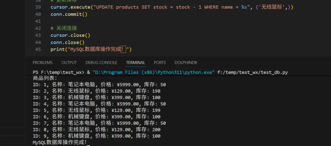 import mysql.connector# 连接到MySQL数据库conn = mysql.connector.connect(    host='localhost',    user='root',    password='your_password',    database='test_db')cursor = conn.cursor()# 创建表cursor.execute('''    CREATE TABLE IF NOT EXISTS products (        id INT AUTO_INCREMENT PRIMARY KEY,        name VARCHAR(255) NOT NULL,        price DECIMAL(10, 2),        stock INT DEFAULT 0    )''')# 插入数据sql = "INSERT INTO products (name, price, stock) VALUES (%s, %s, %s)"values = [    ('笔记本电脑'5999.0050),    ('无线鼠标'129.00200),    ('机械键盘'399.00100)]cursor.executemany(sql, values)conn.commit()# 查询数据cursor.execute("SELECT * FROM products")print("商品列表:")for row in cursor.fetchall():    print(f"ID: {row[0]}, 名称: {row[1]}, 价格: ¥{row[2]}, 库存: {row[3]}")# 更新库存cursor.execute("UPDATE products SET stock = stock - 1 WHERE name = %s", ('无线鼠标',))conn.commit()# 关闭连接cursor.close()conn.close()print("MySQL数据库操作完成!")