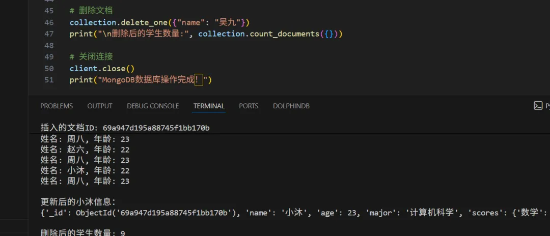from pymongo import MongoClient# 连接到MongoDBclient = MongoClient('mongodb://localhost:27017/')db = client['test_database']  # 选择数据库collection = db['students']   # 选择集合# 插入单条文档student = {"name""赵六","age"22,"major""计算机科学","scores": {"数学"95"英语"88"编程"92}}result = collection.insert_one(student)print(f"插入的文档ID: {result.inserted_id}")# 插入多条文档students = [    {"name""孙七""age"21"major""软件工程"},    {"name""周八""age"23"major""数据科学"},    {"name""吴九""age"20"major""人工智能"}]results = collection.insert_many(students)print(f"插入的文档数量: {len(results.inserted_ids)}")# 查询文档print("\n所有学生信息:")for student in collection.find():    print(f"姓名: {student['name']}, 年龄: {student['age']}, 专业: {student['major']}")# 条件查询print("\n年龄大于21的学生:")for student in collection.find({"age": {"$gt"21}}):    print(f"姓名: {student['name']}, 年龄: {student['age']}")# 更新文档collection.update_one(    {"name""小沐"},    {"$set": {"age"23}})print("\n更新后的小沐信息:")print(collection.find_one({"name""小沐"}))# 删除文档collection.delete_one({"name""吴九"})print("\n删除后的学生数量:", collection.count_documents({}))# 关闭连接client.close()print("MongoDB数据库操作完成!")