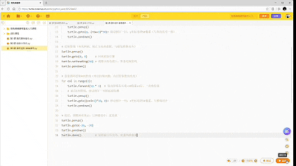 第一步:清空代码区,输入完整代码(注释清晰,可直接复制,逻辑简单,贴合新手):import turtleturtle.pensize(1) # 画笔粗细1像素,网格线条更清晰turtle.setheading(0) # 设定小海龟正向(朝右),避免绘制方向错乱turtle.color("black")# 网格颜色统一为黑色,更整洁美观# 嵌套循环绘制3行4列网格(修正逻辑,避免绘制错乱,线条更整齐)# 外层循环:控制网格的行数(3行横线)for row in range(3): # 内层循环:控制每行横线的长度(1段,50像素×4列,避免多余转弯) turtle.forward(50 * 4) # 每行横线总长度=50像素×4列,一次性绘制更整齐 # 画完1行横线,移动到下一行的起始位置 turtle.penup() turtle.goto(0, (row+1)*50)# 移动到下一行,y坐标递增50像素(与单段长度一致) turtle.pendown()# 绘制竖线(补充网格,修正方向和逻辑,与横线精准对齐)turtle.penup()turtle.goto(0, 0) # 回到初始位置turtle.setheading(90) # 调整小海龟朝上,准备绘制竖线turtle.pendown()# 嵌套循环绘制4列竖线(外层控制列数,内层控制竖线长度)for col in range(4): turtle.forward(50 * 3) # 每列竖线总长度=50像素×3行,一次性绘制 # 画完1列竖线,移动到下一列的起始位置 turtle.penup() turtle.goto((col+1)*50, 0)# 移动到下一列,x坐标递增50像素,与横线对齐 turtle.pendown()# 优化:调整画布显示,让网格居中,更美观turtle.penup()turtle.goto(-20, -20)turtle.pendown()turtle.done() # 保持窗口不关闭,欣赏网格效果