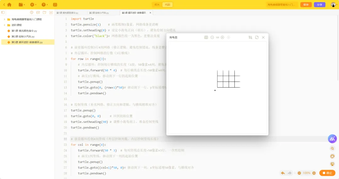 打开你的海龟编辑器,跟着以下两个案例操作,亲手感受嵌套循环的便捷性,每一步都有详细讲解,新手也能轻松跟上~案例1:用嵌套循环绘制简单网格(最基础,必练!)