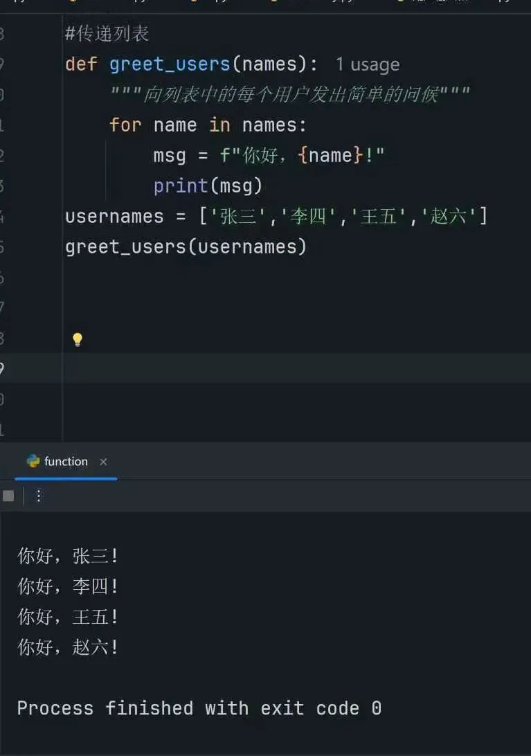 1.定义函数greet_users() 并接受一个名字列表,将其赋值给形参names。