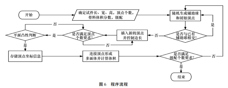 基于 ABAQUS软件强大的二次开发能力ꎬ本文 结合 Python语言的建模程序ꎬ提出了一种基于八面 体生成凸多面体骨料的三维建模方法[10]ꎮ引入辅 助球来构造骨料基ꎬ骨料的大小和位置由辅助球控 制ꎬ辅助球半径即为骨料粒径ꎬ然后对骨料基进行随 机延拓生成任意凸多面体骨料ꎬ并根据海伦公式计 算骨料体积ꎬ实现了对级配的精准控制本文采用球体的内切多面体生成骨料模型ꎬ并 以此为基础ꎬ通过辅助球体方法生成凸多面体骨料ꎮ为了获得较高的骨料含量ꎬ需按照骨料粒径由大到 小的分级顺序ꎬ逐个创建和放置骨料网格划分是细观数值模型建立的关键ꎬ合理的 网格密度可以更精确地模拟混凝土内部细观层面的 受力情况ꎬ从而更好地反映其宏观力学性能ꎮ此外ꎬ网格划分还可以提高模拟的精度ꎬ减少计算时间ꎬ提 高模拟的效率ꎮ由于多面体骨料颗粒形状随机ꎬ细观结构高度非结构化ꎬ四面体网格能更好地模拟骨 料的真实形状ꎬ同时为体现多面体骨料表面不规则 棱角处的应力集中ꎬ本文采用四面体网格对骨料和 砂浆进行划分ꎬ网格划分如图5 所示基于辅助球体的方式产生凸多面体骨料的生成 算法流程如图 6所示ꎬ建模效果如图 7所示ꎬ在 3种 不同骨料体积分数的情况下ꎬ具体生成的骨料数量和分布如图 8所示ꎮ其中不同尺寸的多面体骨料分 别包括直径为 15mm、10mm和 5mm的骨料颗粒ꎮ图 8(a)包含 8个直径为 15mm、20个直径为 10mm和 120个直径为 5mm的骨料ꎻ图 8(b)包含 11个直 径为 15mm、26个直径为 10mm和 150个直径为5mm的骨料ꎻ图 8(c)包含 15个直径为 15mm、30个 直径为10mm和200个直径为 5mm的骨料ꎮ可以 看出该算法可以很好地模拟骨料的生成情况ꎮ1)随机确定多面体骨料的最大顶点数ꎬ在混凝 土内部生成辅助球的坐标信息ꎬ并在辅助球表面随 机生成 1个初始点2)插入 1个新的顶点ꎬ需控制由多面体骨料组 成的插入点之间的边长ꎬ即新生成的边长需大于lminꎮ如果新插入的顶点超出指定范围ꎬ则返回重新 生成ꎮ3)重复步骤 2)ꎬ直到插入集合的所有顶点满足 个数要求ꎮ4)遍历所有已生成的顶点ꎬ顶点与其余任选 2个顶点形成三角面ꎬ判断剩余凸体的点是否全部位 于三角面的同一侧ꎬ否则舍去重新进入循环ꎮ5)满足上述条件的顶点可与凸多面体上可见三 角形的顶点连接形成新边ꎮ6)随机生成下 1个辅助球球心坐标信息ꎬ并判 断其与已生成的辅助球是否存在干涉ꎮ在辅助球表 面随机生成初始点ꎬ返回步骤 2)ꎬ直到所有骨料个 数达到级配要求ꎮ本文基于 Python脚本对 ABAQUS软件进行了 二次开发处理ꎬ基于空间八面体骨料模型建立了混 凝土的细观有限元模型ꎬ发挥了 ABAQUS二次开发 在复杂构件参数化方面的强大优势ꎮ通过研究发现:1)凸多面体骨料模型更加符合工程实际ꎬ并且向 量法判定随机多面体凹凸性简单易行ꎬ同时采用海 伦公式计算凸多面体体积可实现对骨料体积分数精 确控制ꎻ2)该方法建模效率高ꎬ可满足未来各类级配 的多面体混凝土骨料细观模型建模ꎬ为混凝土复合 材料的损伤研究提供建模支持ꎮ【有兴趣的同学可以尝试,遇到任何问题欢迎交流,有需要可以免费答疑解惑,模型代做辅导教学】