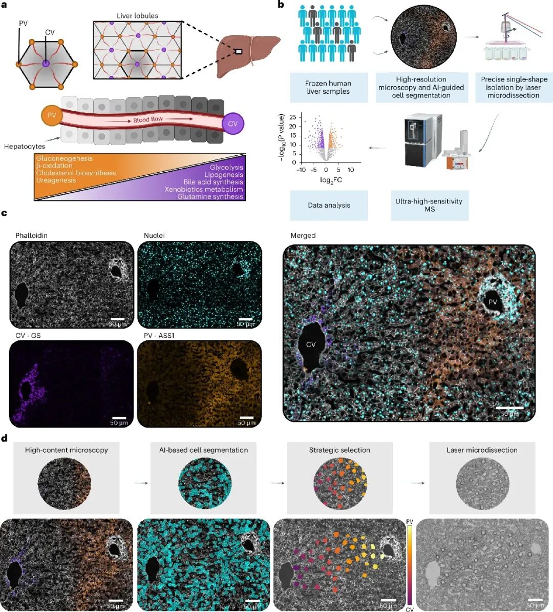 理解蛋白质分布模式在组织结构中对解读健康和疾病中的器官功能至关重要。肝脏是最大的内脏,在协调葡萄糖稳态、蛋白质合成、胆汁生成和解毒有害物质等关键过程中起着关键作用。为了高效管理这些多样的功能,肝脏进化出了独特的解剖结构。通过肝叶的定向血流——最小的功能单元——在该轴上形成明显的代谢和信号梯度。尽管肝细胞在组织学上看起来相似,但它们在小叶中的位置不同,执行的代谢功能往往截然不同,且常常相互矛盾——这一现象被称为肝区分区现象。门膜周围肝细胞主要参与糖新生和脂肪酸氧化,而中心周围肝细胞则专注于糖酵解和脂生成。肝脏分区的精确映射和更高的空间分辨率对于彻底研究肝脏生理和疾病至关重要。准确定量蛋白质作为功能参与者在肝病中尤为重要,因为肝病中翻译和翻译后调控,包括蛋白质更新,常常驱动病理过程该团队展示了单细胞深度视觉蛋白质组学在本地肝组织中对单个细胞进行空间解析蛋白质组分析的应用。该团队建立了由战略细胞选择和连续蛋白质梯度映射组成的稳健框架,支持对更大临床队列的研究。通过分析18名个体的数百个分离肝细胞,绘制了人类肝蛋白组的全面空间图。 该研究的所有分析数据及代码都是对外开放,感兴趣的老师们可以下载,欢迎一起讨论~