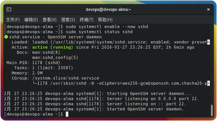 为了在启动 SSH 服务后确认其是否正常工作,运行以下命令:sudo systemctl status sshd