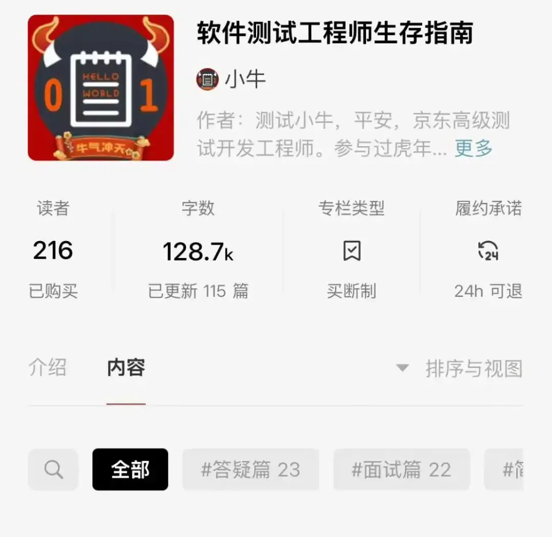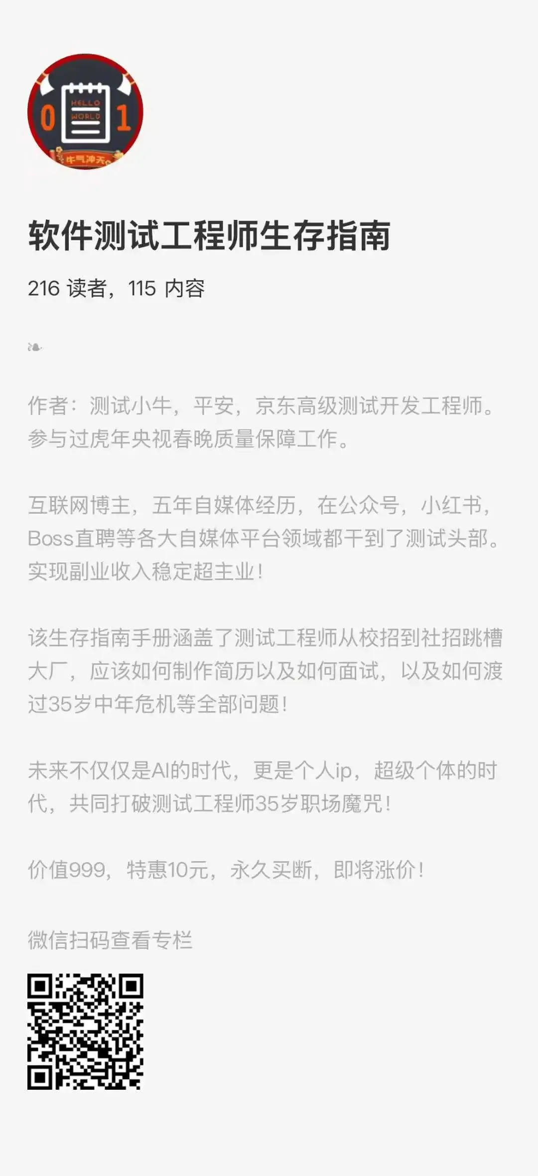 最后,小牛原创编写了一本测试工程师生存指南手册,全册110+篇干货,共计13万左右文字。微信识别下图二维码购买,限时10元,一顿早餐,永久买断!