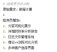 # 第一次交付 ✓ 基础装箱功能 ✗ 分层不合理(1cm薄层) ✗ 只有CLI界面 ✗ 日志不完整 # 程序员要求改进: 1. 分层逻辑要符合实际 2. 改为Web界面方便使用 3. 日志要详细记录所有信息 # 最终版本: ✓ 合理分层(固定10cm,明确跨层) ✓ Web界面,操作便捷 ✓ 完整日志,便于追溯 ✓ 良好性能,快速计算 |