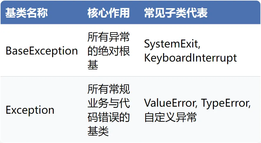 很多初学者会误以为 Exception 是最大的类,其实不然。系统级别的退出信号和常规的代码错误在顶层被严格区分开来。