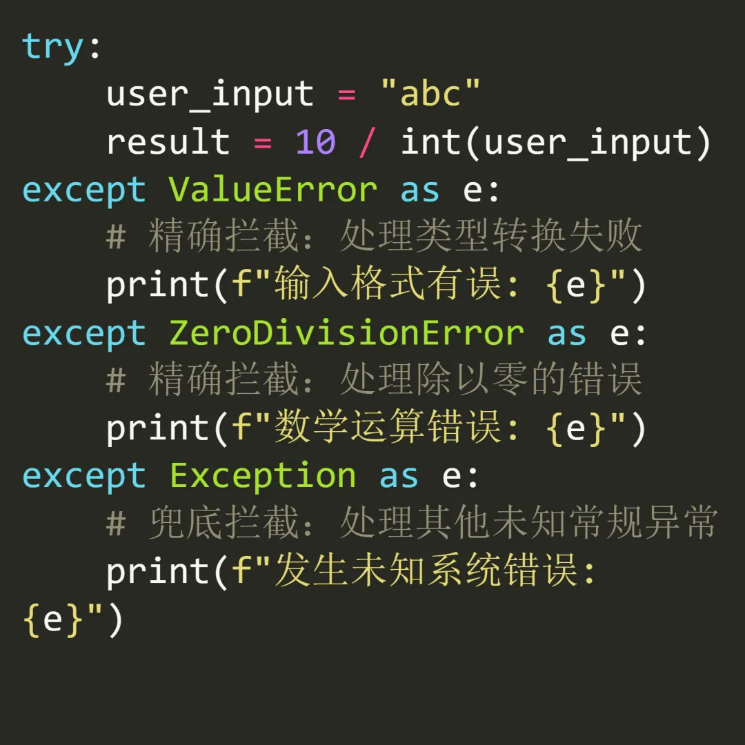 最基础的原则是:越具体的异常,越应该放在前面捕获。Python 的异常捕获是从上到下逐一匹配的,一旦匹配成功,后续的 except 分支将被忽略。