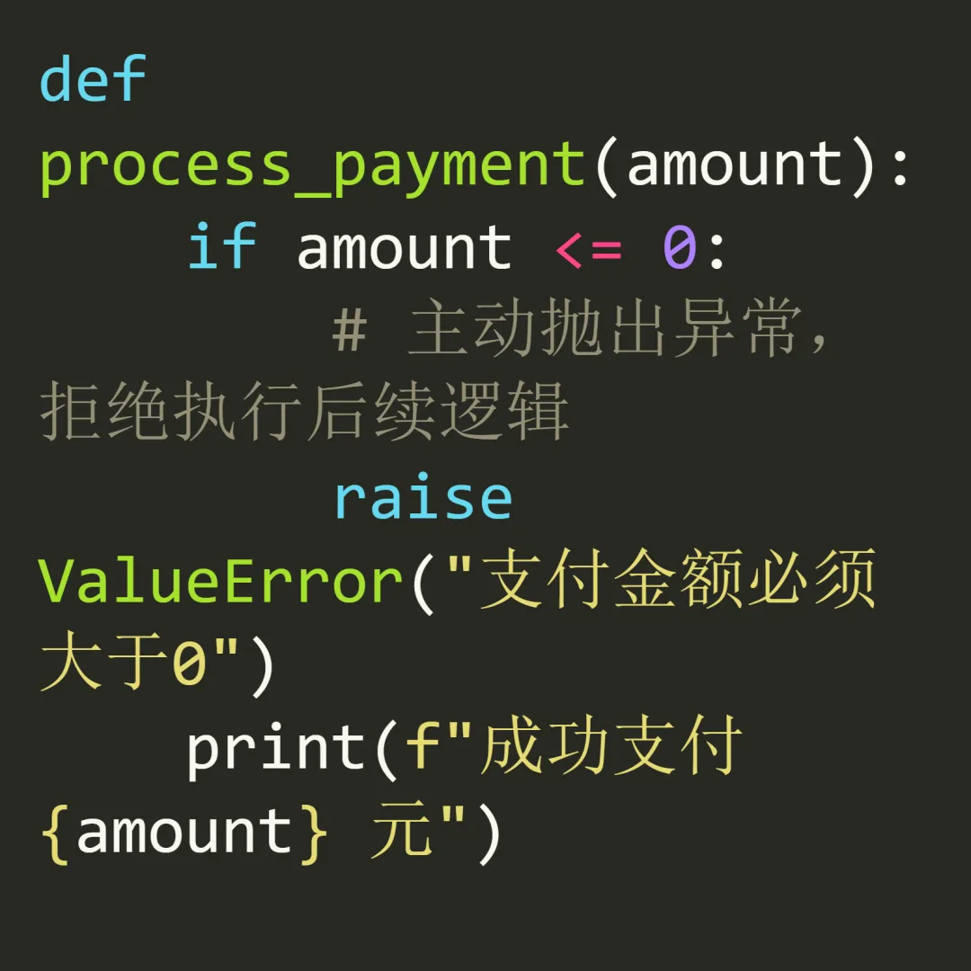 异常不仅是被动防守的工具,更是主动控制程序控制流的利器。当我们在编写函数或类时,一旦校验到业务规则不符(例如:提现金额大于余额,或者用户无权限),应当立即使用 raise 关键字阻断程序运行,并将错误信息向上层抛出。