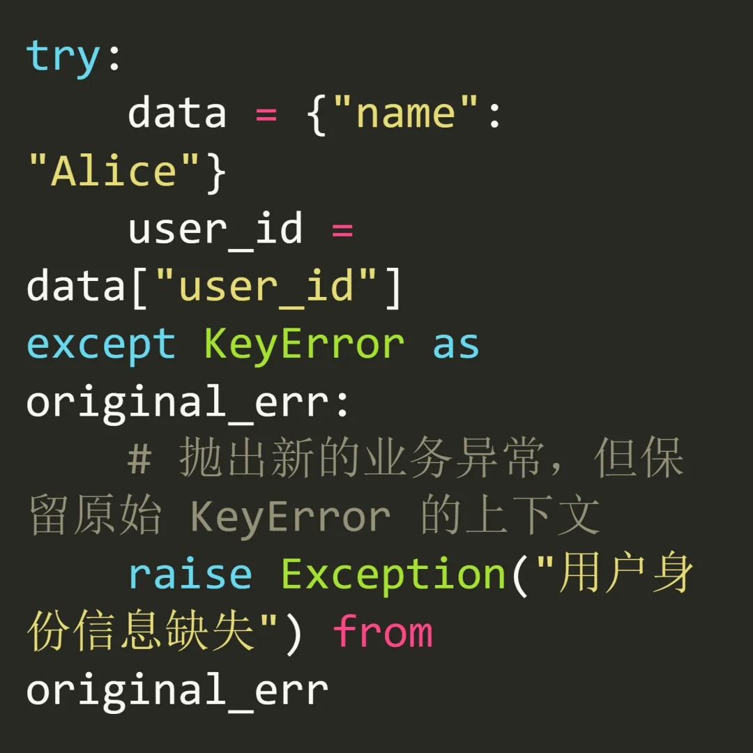 此时我们需要使用 raise … from … 语法,这被称为异常链。它允许你在捕获底层异常后,抛出一个业务层面的新异常,同时在底层偷偷保留原始错误的堆栈追踪,方便后续排查。