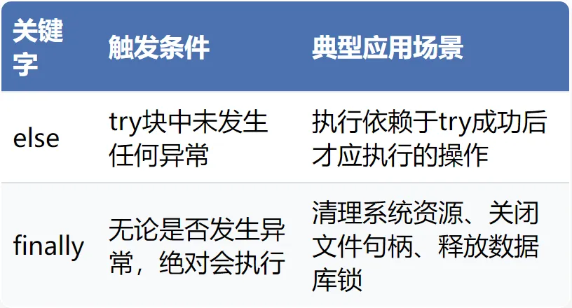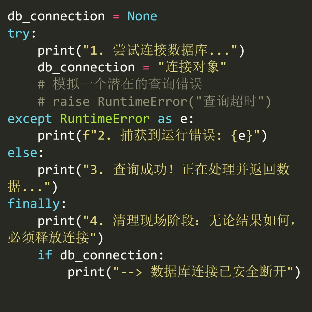 一个具备工业级水准的异常处理结构,绝不仅仅只有 try 和 except。Python 提供了 else 和 finally 关键字,以覆盖完整的代码执行生命周期。