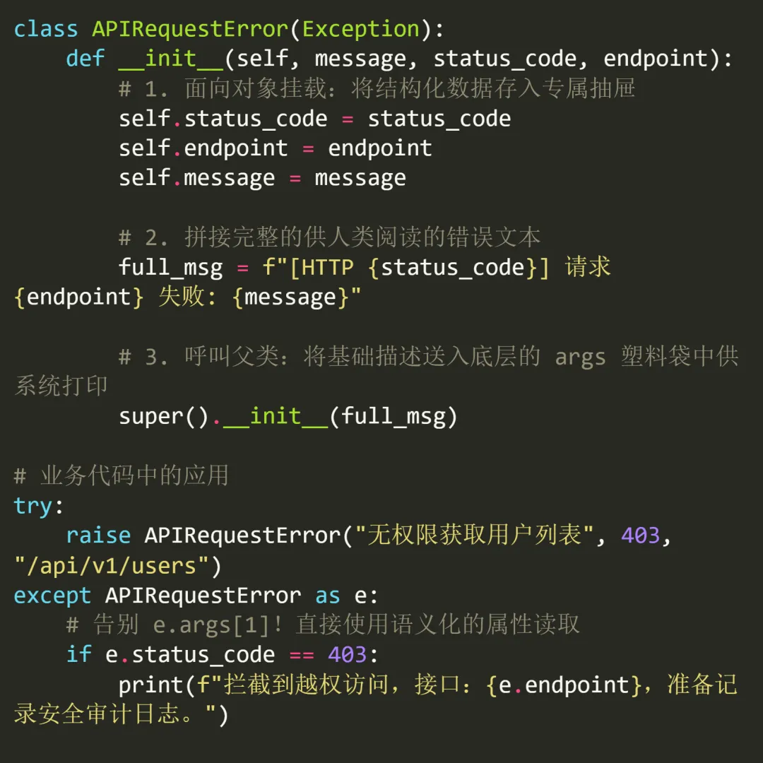 现代架构要求我们抛弃这种野蛮的取值方式。异常应当被视为一个严谨的数据载体。我们需要通过继承基类,自己打造拥有专属标签抽屉的收纳盒(即实例属性self.xxx)。