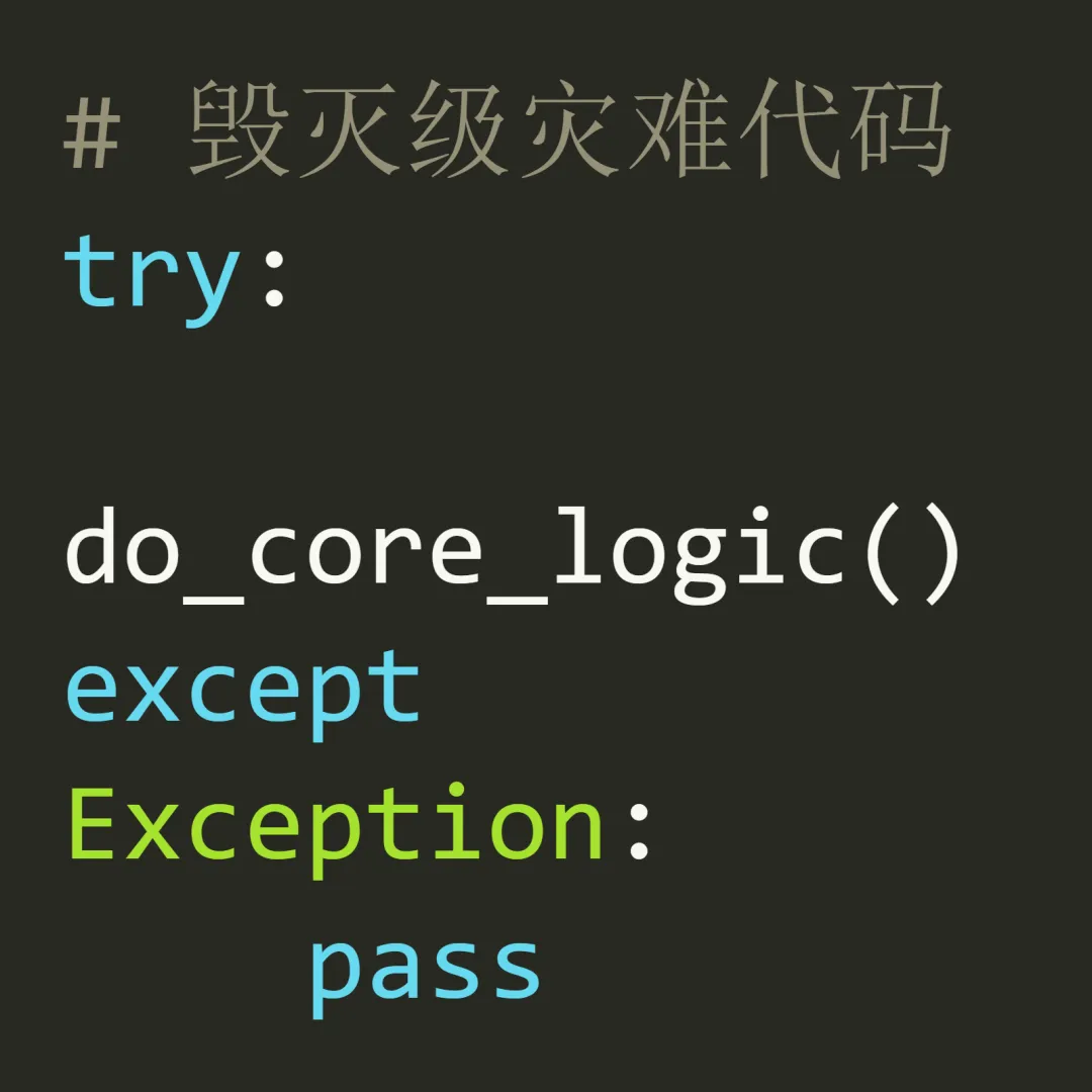 在所有糟糕的代码中,最令人窒息的反模式就是裸奔的 except 或仅包含 pass 的捕获块。