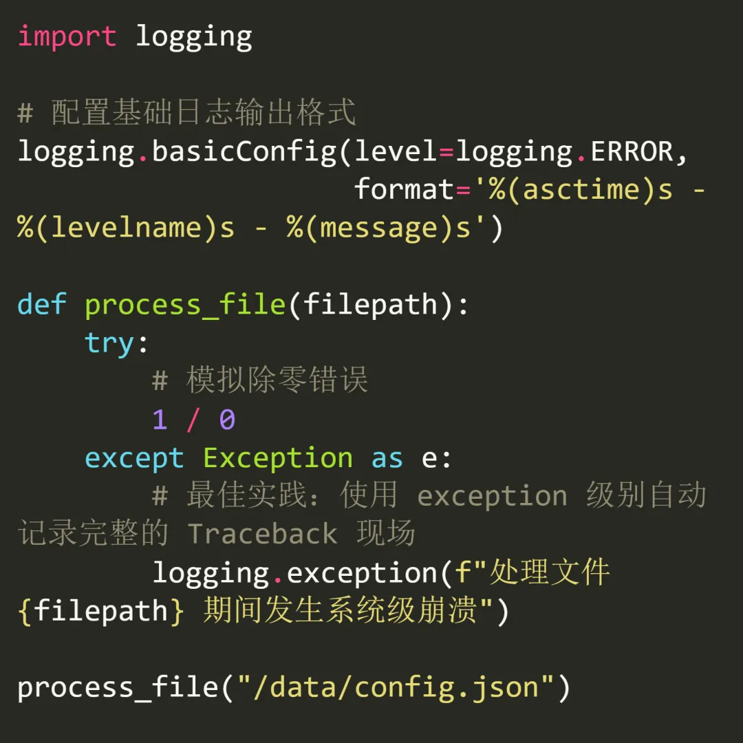仅仅打印 print(e) 往往只能得到一句干瘪的错误提示语,丢失了最关键的报错文件路径和具体的代码行号(Traceback)。在生产环境中,异常处理必须与 Python 的 logging 模块深度绑定。