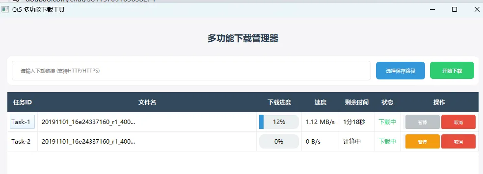 基于 Python Qt5 的多功能下载工具,这个工具支持多任务下载、暂停/继续、取消下载、进度显示和下载速度统计等核心功能。