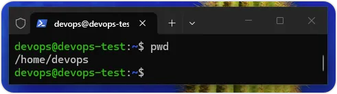 请开启 Windows 终端机启动并进入 Linux 发行版 Ubuntu 和切换至用户目录,然后就可以输入pwd后,按 Enter 键,显示当前的工作目录「/home/devops」,因为预设的登录用户名是devops,如下图所示:
