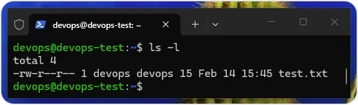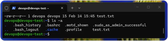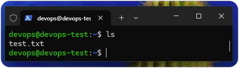 上述命令可以显示当前工作目录「/home/devops」下的文件和目录清单,test.txt就是前面文章中建立的文本文件,如下图所示: