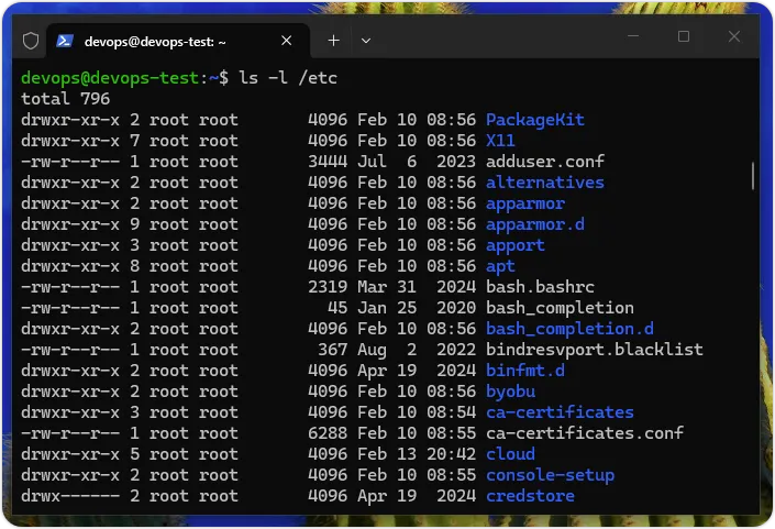 上述命令在输入ls后,空一格,再输入-l选项,可以显示当前工作目录「/home/devops」下文件和目录的详细信息,如下图所示:
