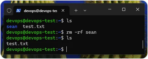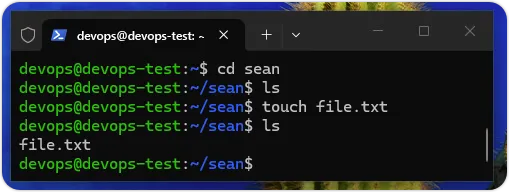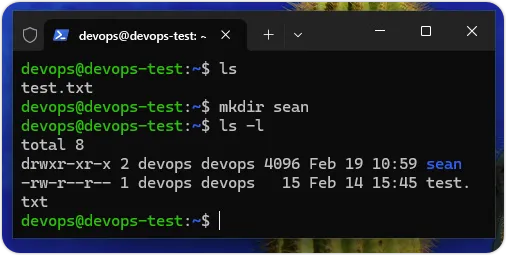 上述命令可以在「/home/devops」目录下,建立名为sean的新目录,如下图所示: