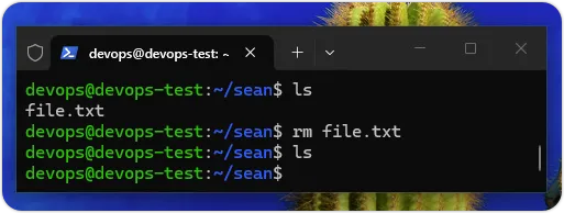 上述命令因为当前工作目录是「/home/devops」,可以删除此目录下的file.txt文件。请注意!rm命令没有真的删除文件,只是标记文件空间成为是可用的空间。