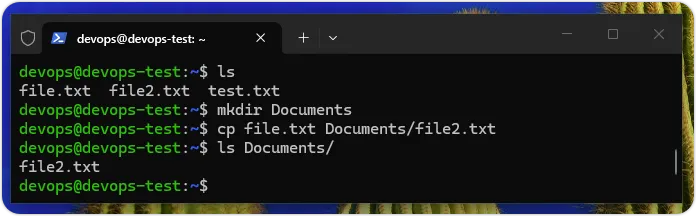 $ mkdir Documents$ cp file.txt Documents/file2.txt