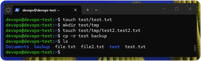 $ mkdir test$ touch test/test.txt$ mkdir test/tmp$ touch test/tmp/test2.txt$ cp -r test backup