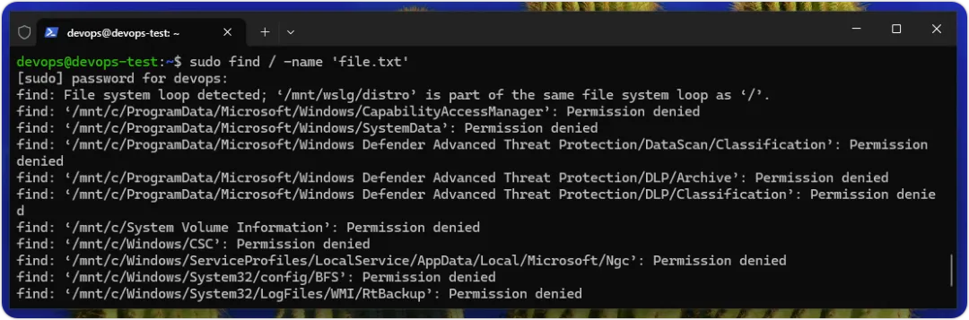 请注意!因为上述执行结果连 Windows 挂载的硬盘都会搜索,请按 【 Ctrl + C 】 键中断命令的执行。我们可以使用第 3-1-4 节的sudo命令以更大权限来执行find命令,如下所示: