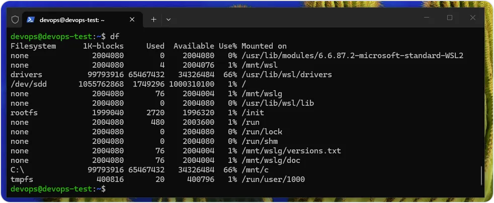 上述命令可以显示所有挂载至文件系统的磁盘清单,和各磁盘空间的使用状况,如下图所示: