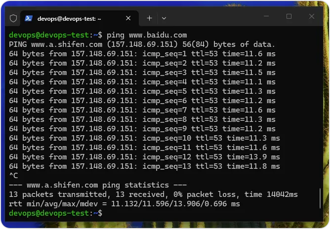 ping命令可以查询其他主机或 IP 地址的连接状态,例如:百度网站www.baidu.com,如下所示:
