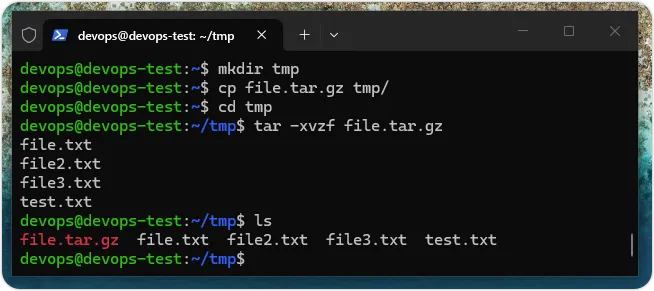 $ mkdir tmp$ cp file.tar.gz tmp/$ cd tmp/$ tar -xvzf file.tar.gz