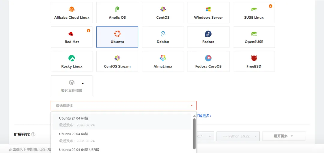 如果你第一次用 Linux 服务器,Ubuntu 22.04 LTS 是最省心的选择,或者也可以选择更新的Ubuntu 24.04 LTS。