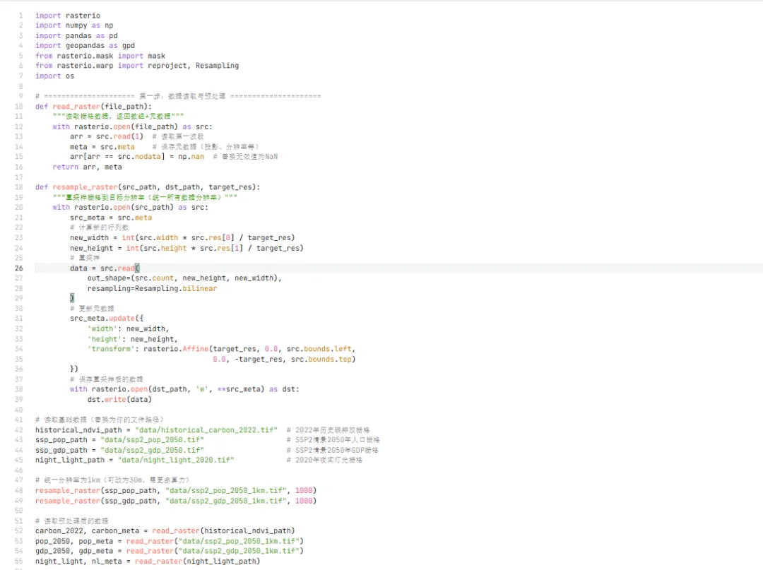 当前“双碳”背景下,如何高效准确预测碳排放对各地精准实施相关政策显得尤为重要,如何高效准确预测碳排放是卡在很多小伙伴前面的一道坎,本文详细的介绍如何通过Python代码预测2020-2100年全国碳排放栅格数据。- 数据准备:整合历史碳排放、SSP 情景驱动因子(人口 / GDP / 土地覆盖)