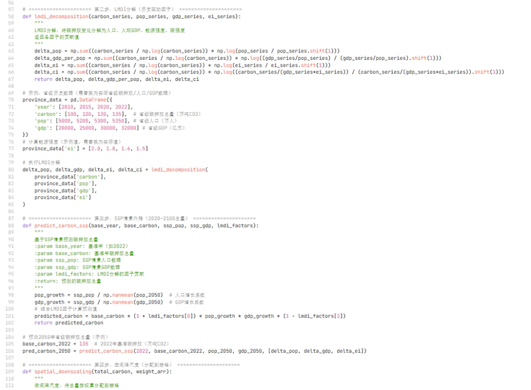 - 时间维度外推:用 LMDI 分解历史碳排放驱动,基于 SSP 情景预测 2020–2100 年省级 / 全国总量