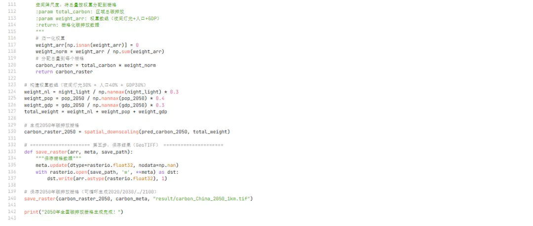 - 结果输出:生成 2020/2030/…/2100 年全国碳排放栅格(GeoTIFF 格式