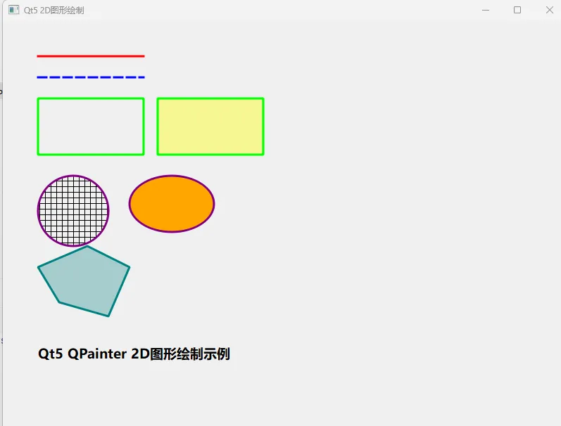 import sysfrom PyQt5.QtWidgets import QApplication, QWidget, QMainWindowfrom PyQt5.QtGui import QPainter, QPen, QBrush, QColor, QFontfrom PyQt5.QtCore import Qt, QPointclassDrawWidget(QWidget):"""自定义绘图控件,所有2D图形都在这里绘制"""defpaintEvent(self, event):# 1. 创建QPainter对象,指定绘制设备为当前控件 painter = QPainter(self)# 开启抗锯齿,让图形边缘更平滑 painter.setRenderHint(QPainter.Antialiasing)# ---------------------- 1. 绘制基础线条 ----------------------# 设置画笔:红色、宽度3、实线样式 pen = QPen(QColor(255, 0, 0), 3, Qt.SolidLine) painter.setPen(pen)# 绘制直线:从(50, 50)到(200, 50) painter.drawLine(50, 50, 200, 50)# 绘制虚线 pen.setStyle(Qt.DashLine) pen.setColor(QColor(0, 0, 255)) # 蓝色 painter.setPen(pen) painter.drawLine(50, 80, 200, 80)# ---------------------- 2. 绘制几何图形 ----------------------# 绘制矩形(无填充) pen.setStyle(Qt.SolidLine) pen.setColor(QColor(0, 255, 0)) # 绿色 painter.setPen(pen) painter.drawRect(50, 110, 150, 80) # x, y, width, height# 绘制填充矩形 brush = QBrush(QColor(255, 255, 0, 100)) # 黄色,透明度100 painter.setBrush(brush) painter.drawRect(220, 110, 150, 80)# 绘制圆形(椭圆的特殊形式:宽高相等) pen.setColor(QColor(128, 0, 128)) # 紫色 painter.setPen(pen) painter.setBrush(QBrush(Qt.CrossPattern)) # 交叉填充样式 painter.drawEllipse(50, 220, 100, 100) # x, y, width, height# 绘制椭圆 painter.setBrush(QBrush(QColor(255, 165, 0))) # 橙色实心 painter.drawEllipse(180, 220, 120, 80)# ---------------------- 3. 绘制多边形 ----------------------# 定义多边形顶点 points = [ QPoint(50, 350), QPoint(120, 320), QPoint(180, 350), QPoint(150, 420), QPoint(80, 400) ] pen.setColor(QColor(0, 128, 128)) # 青绿色 painter.setPen(pen) painter.setBrush(QBrush(QColor(0, 128, 128, 80))) # 半透明青绿色 painter.drawPolygon(points)# ---------------------- 4. 绘制文字 ----------------------# 设置字体 font = QFont("微软雅黑", 14, QFont.Bold) painter.setFont(font) painter.setPen(QColor(0, 0, 0)) # 黑色文字 painter.drawText(50, 480, "Qt5 QPainter 2D图形绘制示例")classMainWindow(QMainWindow):"""主窗口"""def__init__(self): super().__init__()# 设置窗口属性 self.setWindowTitle("Qt5 2D图形绘制") self.setGeometry(100, 100, 800, 600) # x, y, width, height# 创建自定义绘图控件并设为中心窗口 self.draw_widget = DrawWidget() self.setCentralWidget(self.draw_widget)if __name__ == "__main__":# 初始化Qt应用 app = QApplication(sys.argv)# 创建并显示主窗口 window = MainWindow() window.show()# 运行应用事件循环 sys.exit(app.exec_())