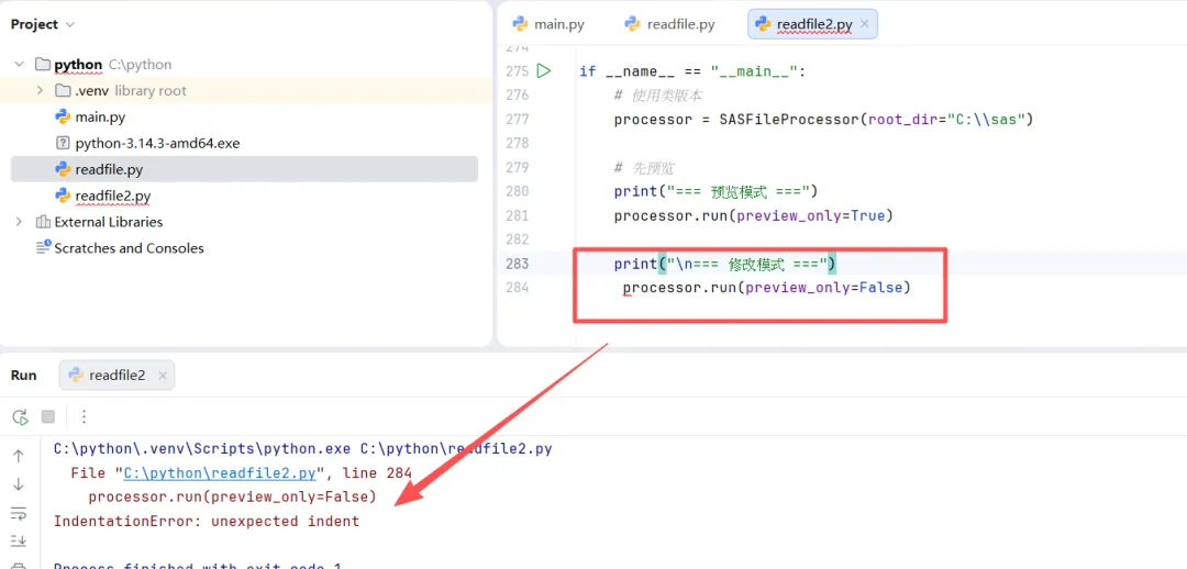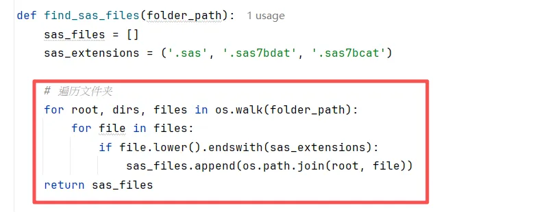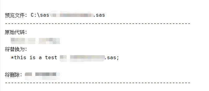 import osimport refrom pathlib import Pathfrom typing import List, Tupleimport shutilfrom datetime import datetimeclass SASFileProcessor: """SAS文件处理器,用于批量替换文件中的代码""" def __init__(self, root_dir: str, backup: bool = True): """ 初始化处理器 Args: root_dir: 要处理的根目录 backup: 是否在修改前创建备份 """ self.root_dir = Path(root_dir) self.backup = backup self.processed_files = [] self.modified_files = [] self.errors = [] # 定义替换规则 self.replacements = [ # 规则1:替换 PGM 为 *this is a test ( r'PGM;', '*this is a test;' ), # 规则2:替换 %macro cc; 为 %macro zz; ( r'%macro cc;', '%macro zz;' ) ] def find_sas_files(self) -> List[Path]: """查找所有.sas文件""" sas_files = list(self.root_dir.rglob("*.sas")) print(f"找到 {len(sas_files)} 个SAS文件") return sas_files def create_backup(self, file_path: Path) -> Path: """创建文件备份""" backup_dir = self.root_dir / "backup" / datetime.now().strftime("%Y%m%d_%H%M%S") backup_dir.mkdir(parents=True, exist_ok=True) # 保持相对路径结构 relative_path = file_path.relative_to(self.root_dir) backup_path = backup_dir / relative_path backup_path.parent.mkdir(parents=True, exist_ok=True) # 复制文件 shutil.copy2(file_path, backup_path) return backup_path def process_file(self, file_path: Path) -> Tuple[bool, str]: """ 处理单个SAS文件 Returns: (是否修改, 修改后的内容或错误信息) """ try: # 读取文件内容 with open(file_path, 'r', encoding='utf-8', errors='ignore') as f: content = f.read() original_content = content # 应用所有替换规则 for pattern, replacement in self.replacements: content = re.sub(pattern, replacement, content, flags=re.IGNORECASE | re.DOTALL) # 检查内容是否被修改 if content != original_content: # 创建备份(如果需要) if self.backup: backup_path = self.create_backup(file_path) print(f"已备份: {backup_path}") # 写回文件 with open(file_path, 'w', encoding='utf-8') as f: f.write(content) return True, "已修改" else: return False, "无需修改" except Exception as e: return False, f"错误: {str(e)}" def preview_changes(self, file_path: Path, num_lines: int = 5): """ 预览文件中的修改(不实际修改文件) """ try: with open(file_path, 'r', encoding='utf-8', errors='ignore') as f: content = f.read() print(f"\n预览文件: {file_path}") print("-" * 60) # 查找匹配的行 lines = content.split('\n') for i, line in enumerate(lines, 1): for pattern, replacement in self.replacements: # 简化模式用于预览 simple_pattern = pattern.replace(r'\s*', ' ').replace(r'\(', '(').replace(r'\)', ')') if re.search(pattern.replace(r'\s*', '.*?'), line, re.IGNORECASE): print(f"行 {i}: {line.strip()}") print(f"将替换为: {replacement}") print() print("-" * 60) except Exception as e: print(f"预览错误: {e}") def run(self, preview_only: bool = False): """ 运行批量处理 Args: preview_only: 是否只预览不修改 """ print(f"开始处理目录: {self.root_dir}") print(f"模式: {'预览模式'if preview_only else'修改模式'}") print("=" * 60) # 查找所有SAS文件 sas_files = self.find_sas_files() if not sas_files: print("没有找到SAS文件") return # 处理每个文件 for file_path in sas_files: self.processed_files.append(file_path) if preview_only: self.preview_changes(file_path) else: modified, message = self.process_file(file_path) if modified: self.modified_files.append(file_path) print(f"✓ {file_path.name}: {message}") else: print(f" {file_path.name}: {message}") # 输出统计信息 self.print_summary(preview_only) def print_summary(self, preview_only: bool): """输出处理统计""" print("\n" + "=" * 60) print("处理完成!") print(f"总文件数: {len(self.processed_files)}") if not preview_only: print(f"修改文件数: {len(self.modified_files)}") print(f"错误文件数: {len(self.errors)}") if self.modified_files: print("\n已修改的文件:") for file in self.modified_files: print(f" - {file.relative_to(self.root_dir)}") if self.errors: print("\n处理错误的文件:") for error in self.errors: print(f" - {error}") if self.backup and not preview_only: backup_dir = self.root_dir / "backup" if backup_dir.exists(): print(f"\n备份文件保存在: {backup_dir}")def main(): """主函数""" import argparse # 设置命令行参数 parser = argparse.ArgumentParser(description='批量处理SAS文件中的代码替换') parser.add_argument('directory', nargs='?', default='.', help='要处理的目录路径 (默认: 当前目录)') parser.add_argument('--preview', '-p', action='store_true', help='预览模式,不实际修改文件') parser.add_argument('--no-backup', '-nb', action='store_true', help='不创建备份') parser.add_argument('--file', '-f', help='只处理指定的单个文件') args = parser.parse_args() # 创建处理器 processor = SASFileProcessor( root_dir=args.directory, backup=not args.no_backup ) # 如果指定了单个文件 if args.file: file_path = Path(args.directory) / args.file if file_path.exists(): if args.preview: processor.preview_changes(file_path) else: modified, message = processor.process_file(file_path) print(f"{file_path.name}: {message}") else: print(f"文件不存在: {file_path}") else: # 批量处理 processor.run(preview_only=args.preview) # 更简单的版本 - 如果你不需要复杂的功能def simple_sas_replace(): """简单的SAS文件替换函数""" import os # 设置要处理的目录 target_dir = "." # 当前目录 # 定义替换规则 replacements = [ # (模式, 替换文本) (r'pgm;', '*this is a test;'), (r'%macro cc;', '%macro zz') ] # 遍历所有.sas文件 for root, dirs, files in os.walk(target_dir): for file in files: if file.endswith('.sas'): file_path = os.path.join(root, file) try: # 读取文件 with open(file_path, 'r', encoding='utf-8', errors='ignore') as f: content = f.read() original = content # 应用替换 for pattern, replacement in replacements: content = re.sub(pattern, replacement, content, flags